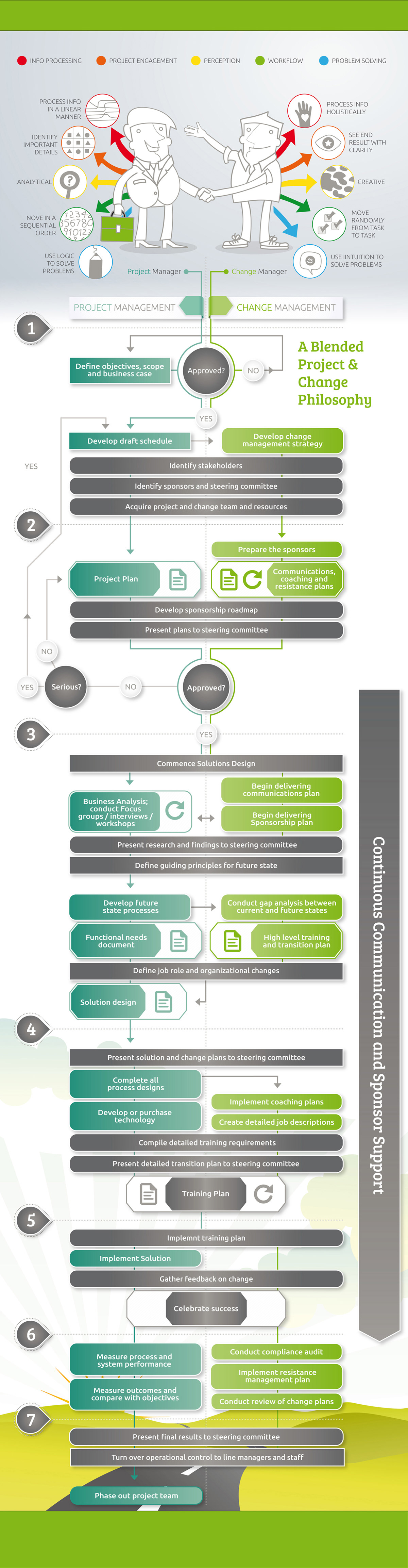 Design a visually engaging infographic diagram that successfully communicates the roles and differences between project and change managers during a project’s lifespan.