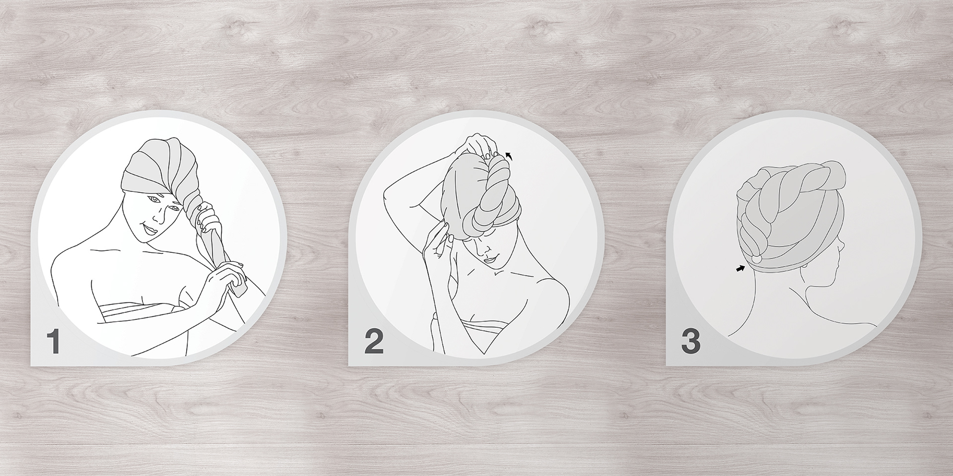 Draw a three-step process on how to use a head towel to be displayed on towel packaging.